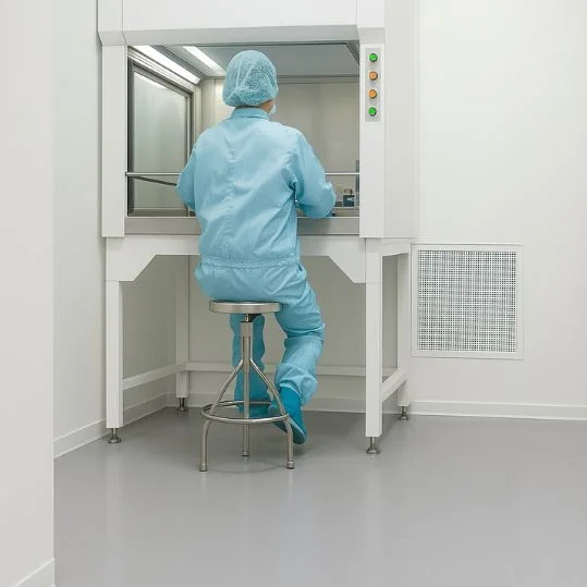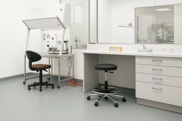 Pisos vinílicos homogéneos, resistentes a productos químicos y fáciles de limpiar en áreas de análisis clínico.